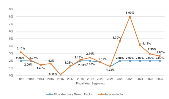The tax cap, which first applied to local governments (excluding New York City) and school districts in 2012, limits annual tax levy increases to the lesser of the rate of inflation or 2% with certain exceptions. The law includes provisions that allow school districts and municipalities to override the cap. DiNapoli’s office calculated the inflation factor at 2.63% for those with a June 30, 2027, fiscal year end.